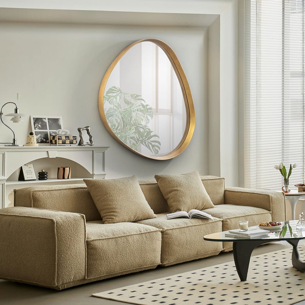 Este espejo asimétrico con marco dorado es una pieza decorativa de gran impacto que aporta elegancia y modernidad a cualquier ambiente. Su forma irregular rompe con lo clásico y añade dinamismo, convirtiéndose en el detalle perfecto para salones, recibidores o dormitorios. El acabado en oro realza la sofisticación del diseño y combina fácilmente con estilos contemporáneos, nórdicos o art déco. Fabricado con materiales de primera calidad, ofrece un reflejo nítido y duradero, ideal para quienes buscan un espejo decorativo exclusivo y lleno de personalidad.