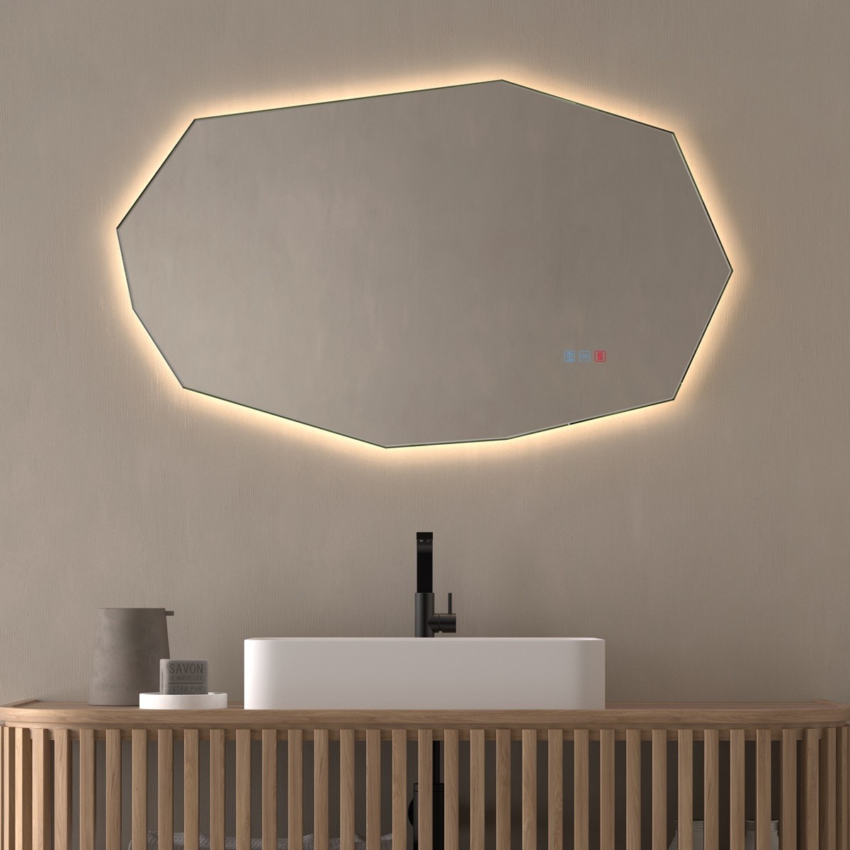 Este espejo decorativo de forma irregular y diseño geométrico es perfecto para quienes buscan un elemento exclusivo en su baño o tocador. Equipado con retroiluminación LED y función antivaho, ofrece una experiencia moderna y funcional. Su forma asimétrica añade un toque artístico que lo convierte en el protagonista de cualquier espacio. El encendido táctil facilita su uso diario. Este espejo de baño moderno es ideal para hoteles, hogares o centros de bienestar que apuestan por un estilo único y elegante, sin renunciar a la practicidad y al confort.
