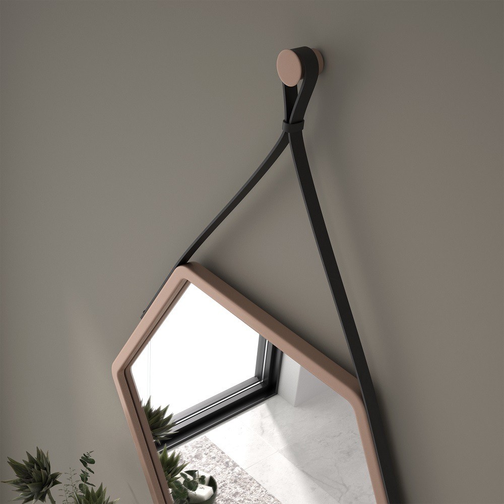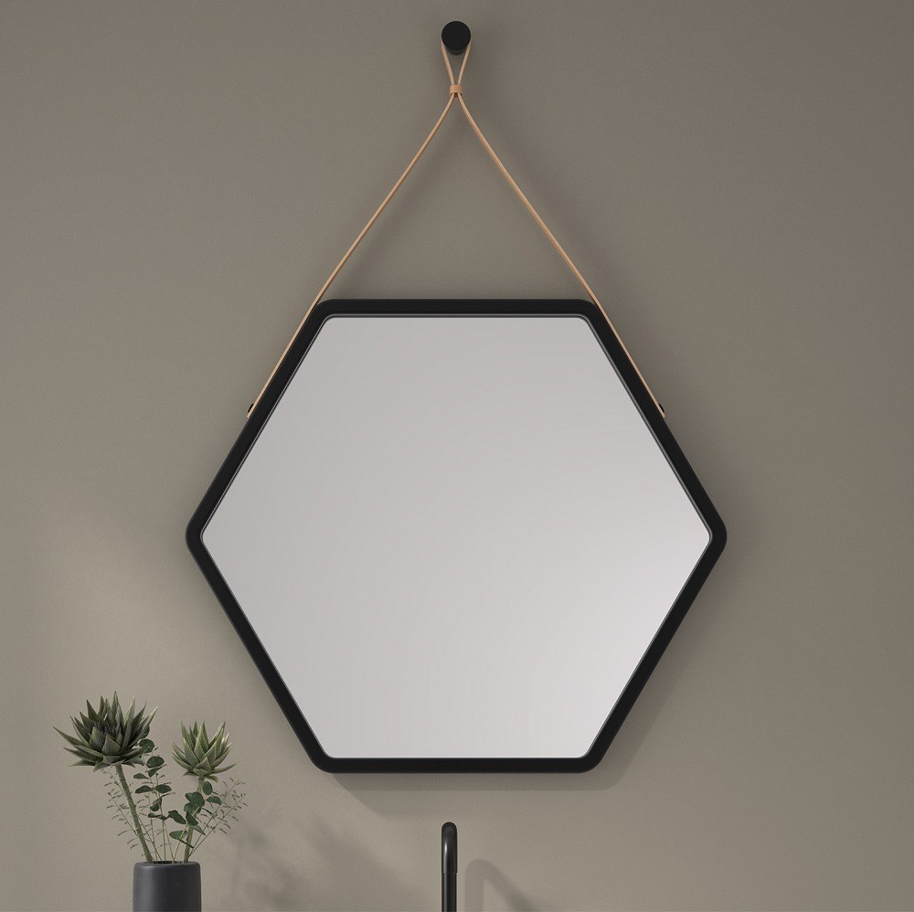 Este espejo hexagonal colgante con marco negro es una pieza original que añade un toque contemporáneo a cualquier espacio. Su forma geométrica rompe con lo convencional, mientras que la correa de cuero sintético en color camel aporta un contraste cálido y elegante. Ideal para baños modernos, entradas o dormitorios, este espejo decorativo de pared ofrece estilo y personalidad sin renunciar a la funcionalidad. El marco negro mate le da carácter y lo convierte en un elemento visual destacado en ambientes minimalistas o de estilo industrial.