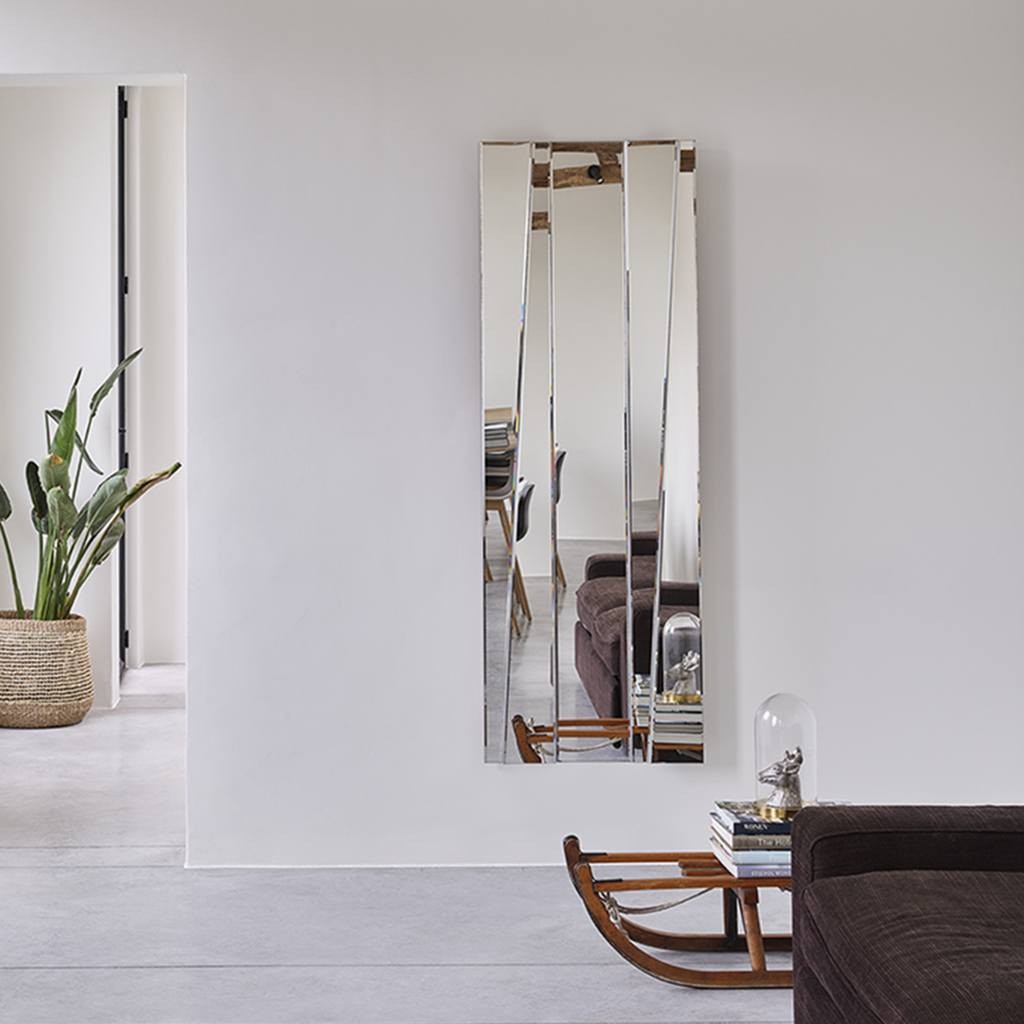 Espejo grande de pared formado por varios espejos biselados montados en un tablero de poliuretano en color plata. Las piezas se colocan de tal ángulo que se obtiene un efecto moderno y muy original. Este espejo se ajusta perfectamente a los interiores de diseño contemporáneo.