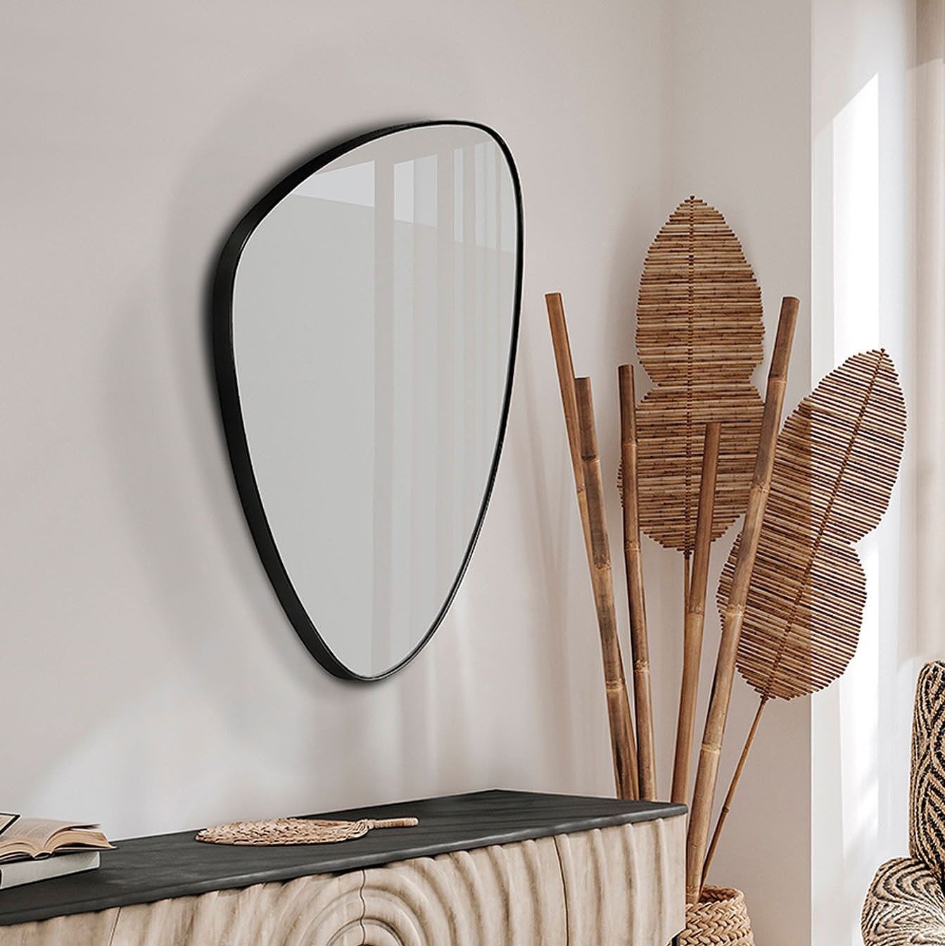 Realza la elegancia de tu entrada con el espejo recibidor triangular Orio Black. Este bello espejo presenta un moderno diseño triangular con un marco negro que añade un toque elegante a cualquier espacio. Ideal para decorar tu entrada, este espejo no solo reflejará tu estilo único, sino que también ampliará visualmente el área, creando una sensación de amplitud.