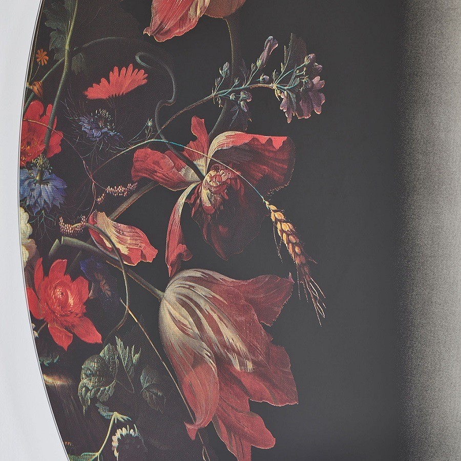 MUSEO es un espejo elegante, redondo e hiper romántico diseñado por la diseñadora holandesa Julia Dozsa. El bodegón original del siglo XVII de Abraham Mignon, del que toma prestado un fragmento asombrosamente detallado, todavía se puede admirar en el famoso Rijksmuseum de Ámsterdam. Eche un vistazo muy de cerca y descubra algo más que hermosos tulipanes e lirios ... El fondo oscuro de este bodegón se mezcla perfectamente con la superficie del espejo.