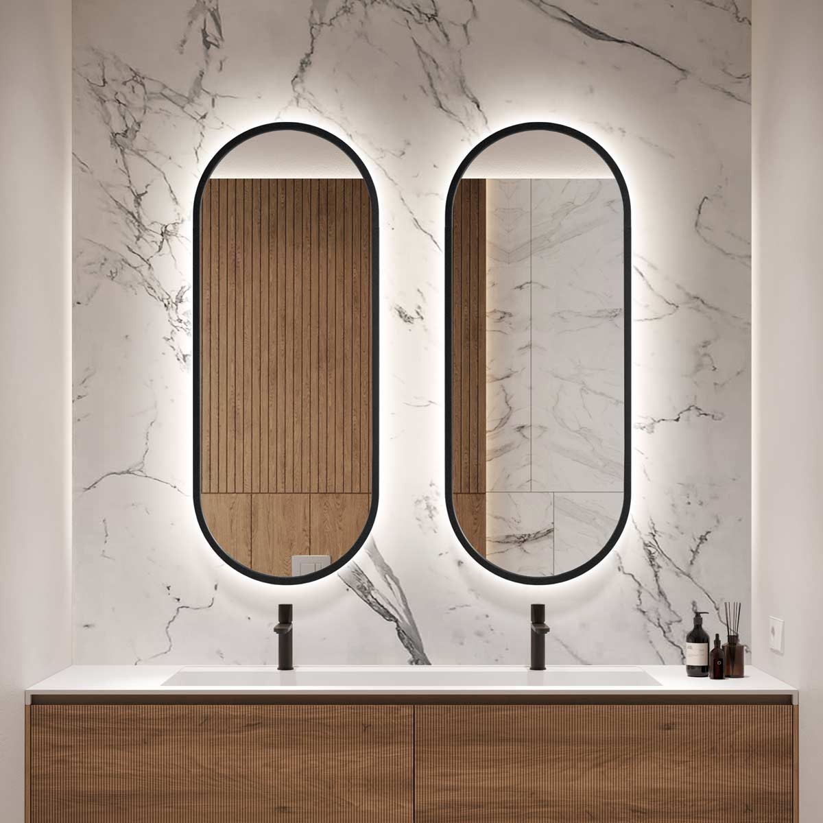 Espejo ovalado retroiluminado con marco negro, ideal para baños modernos y elegantes. Su forma vertical y estilizada aporta un toque sofisticado y armonioso al espacio, destacando sobre paredes de mármol o texturas neutras. La luz LED perimetral ofrece una iluminación ambiental suave, perfecta para crear un ambiente relajante. Este espejo decorativo ovalado es perfecto para interiores minimalistas o de diseño contemporáneo. Combina funcionalidad y estética en una sola pieza, ideal para proyectos de interiorismo actuales con atención al detalle.