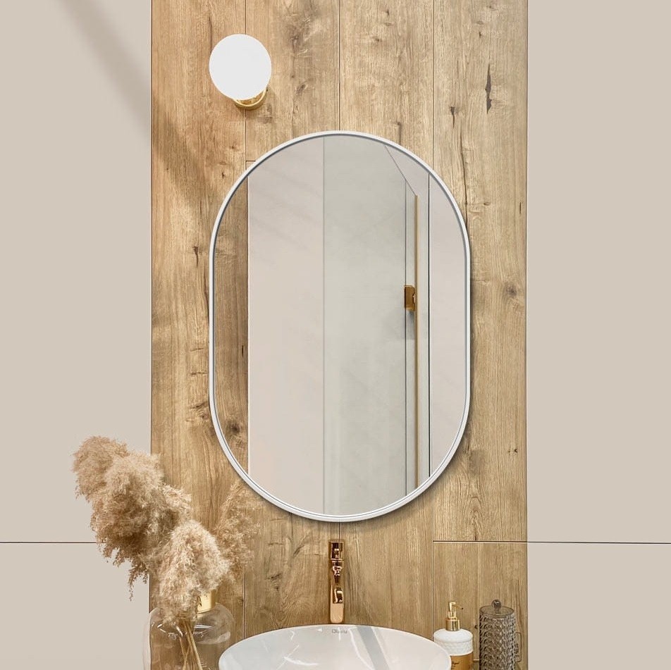 Espejo ovalado con marco blanco y retroiluminación LED, ideal para baños modernos y luminosos. Su diseño vertical estiliza la pared y amplía visualmente el espacio, mientras el marco blanco aporta ligereza y armonía. La luz perimetral integrada ofrece una iluminación acogedora y funcional, perfecta para el uso diario. Este espejo decorativo combina minimalismo y elegancia, adaptándose a revestimientos cerámicos y muebles de madera. Espejo de baño con luz LED y marco blanco, perfecto para interiores contemporáneos y equilibrados.