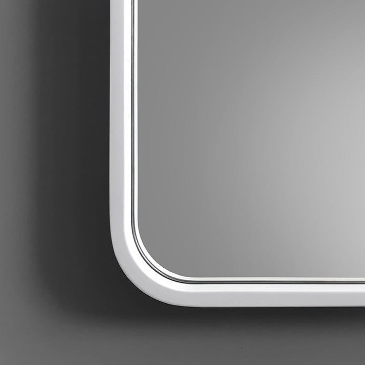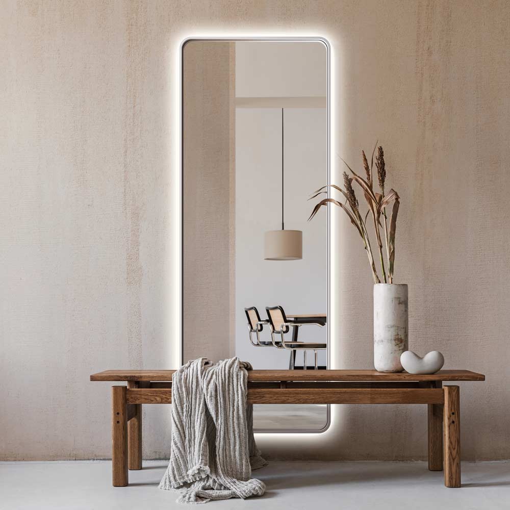 Espejo de cuerpo entero rectangular con esquinas redondeadas, marco blanco y retroiluminación LED, ideal para dormitorios, vestidores, recibidores o pasillos con estilo contemporáneo. Su diseño vertical alarga visualmente la estancia, mientras la luz perimetral LED aporta una iluminación suave, elegante y funcional. El marco blanco añade luminosidad y se integra fácilmente en interiores claros y minimalistas. Espejo decorativo de pie o de pared con luz integrada y marco blanco, perfecto para proyectos de interiorismo que buscan amplitud, estilo y calidez visual.