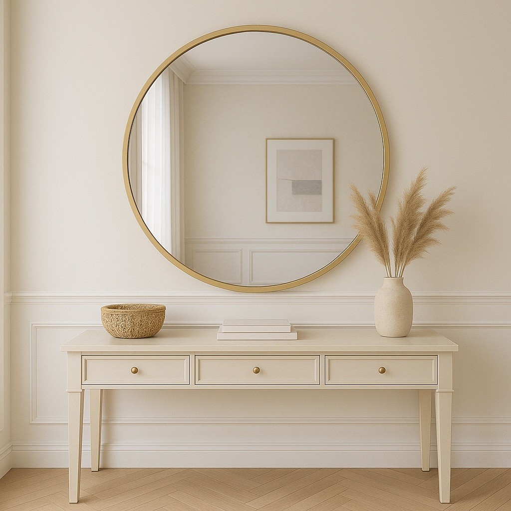 Este espejo redondo con marco dorado es una pieza decorativa ideal para realzar cualquier recibidor, sala o dormitorio. Su diseño minimalista aporta elegancia y sofisticación, mientras que su acabado dorado añade un toque de lujo contemporáneo. Perfecto para recibidores modernos, clásicos o escandinavos, este espejo decorativo de pared amplía visualmente el espacio y aporta luminosidad. Fabricado con materiales de alta calidad, es duradero y fácil de mantener. Una opción perfecta para quienes buscan un espejo grande y moderno con un diseño refinado y atemporal.