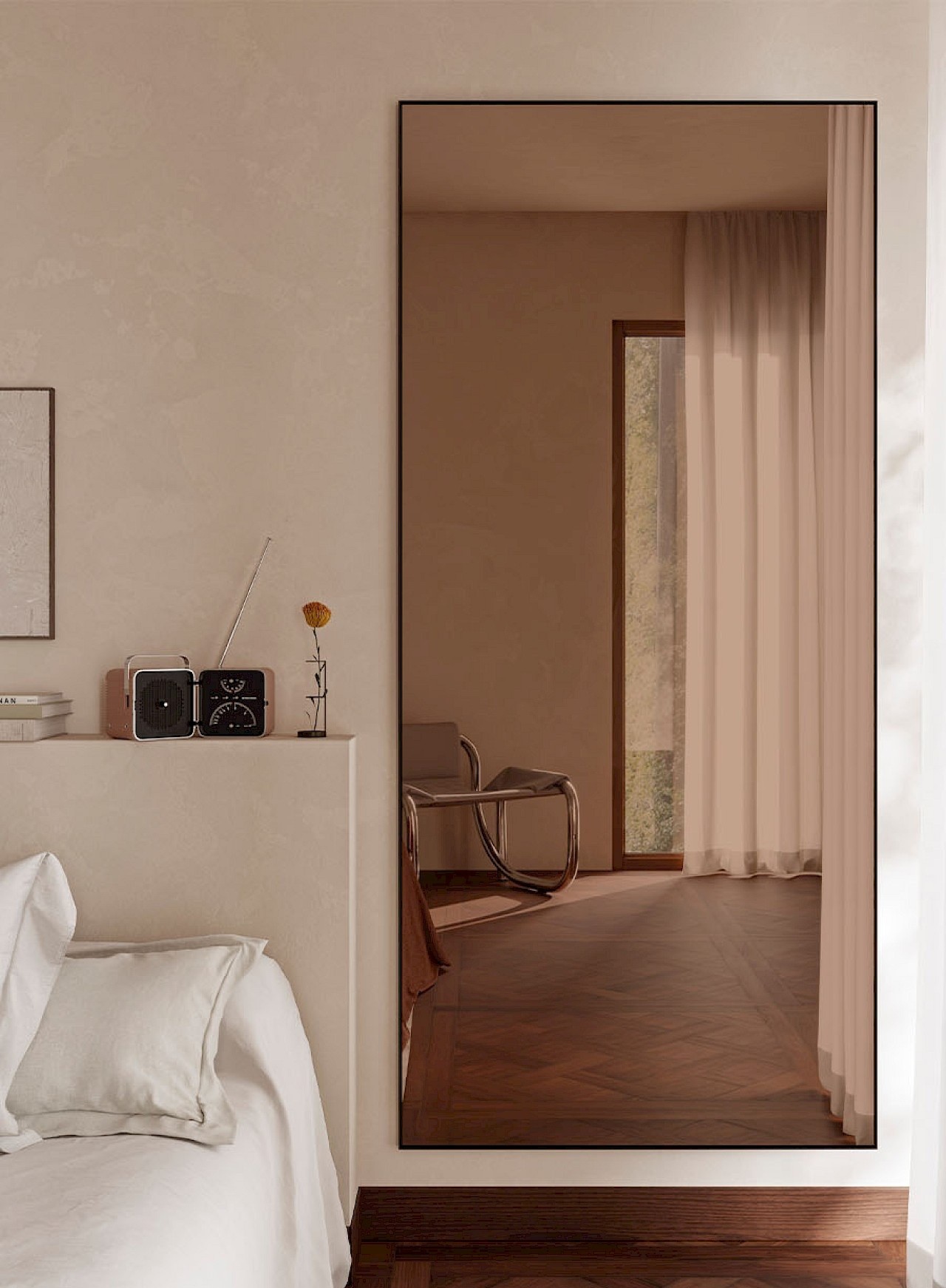 Perfecto como espejo de cuerpo entero, se integra con naturalidad en proyectos de interiorismo donde se busca un equilibrio entre funcionalidad, diseño y estilo atemporal.