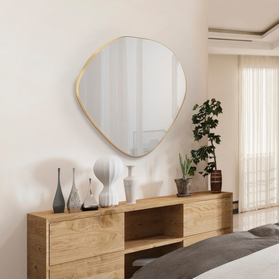 Añade un toque de elegancia contemporánea a tu salón comedor con el espejo aparador moderno Mimo. Este bello espejo combina funcionalidad y estilo para crear un punto focal impresionante en cualquier espacio. El marco dorado asimétrico añade un toque de sofisticación y originalidad, destacando el diseño moderno del espejo.