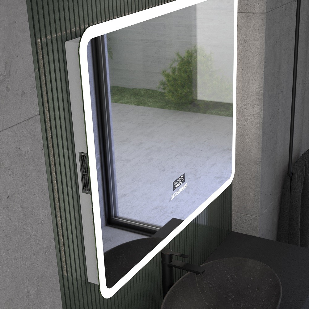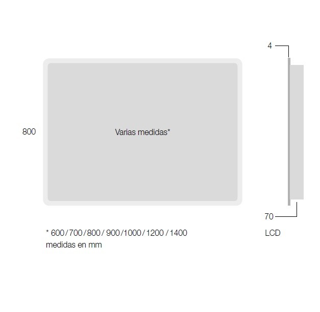 El espejo cuenta con iluminación ambiental indirecta perimetral (luz mural) y otra directa emitida por la parte frontal (vidrio arenado).