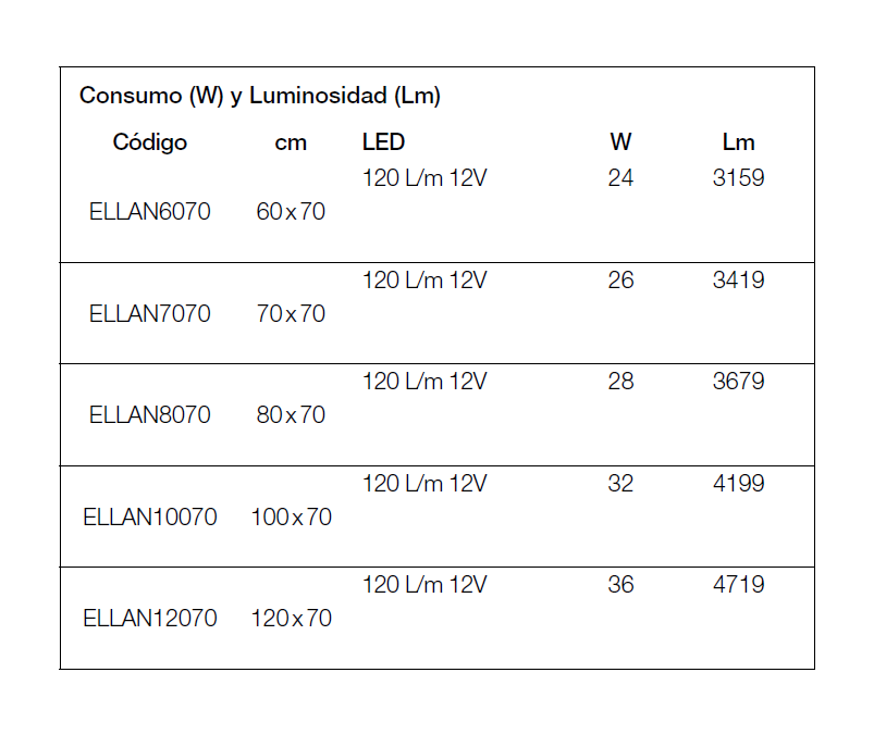 - Colores de iluminación a elegir: Luz fría: 6.000ºK, Luz neutra: 4.000ºK, Luz cálida: 3.000ºK.