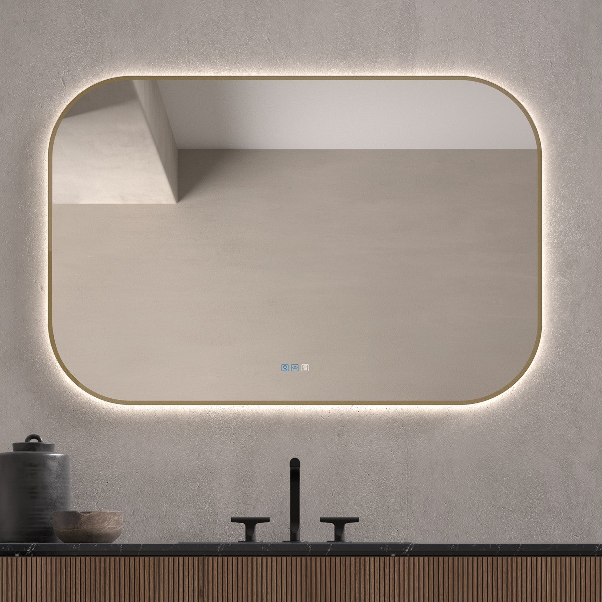 Aporta elegancia a tu baño con este espejo retroiluminado con contorno dorado, una pieza ideal para quienes buscan diseño y funcionalidad. Su forma rectangular con esquinas redondeadas suaviza el espacio, mientras que la iluminación LED trasera ofrece una luz ambiental cálida perfecta para el día a día. El acabado dorado enmarca el espejo, aportando un toque sofisticado y moderno. Fabricado con materiales de alta calidad, este espejo de baño decorativo es fácil de instalar y se adapta a cualquier estilo, desde minimalista hasta clásico, convirtiéndose en el centro de todas las miradas.