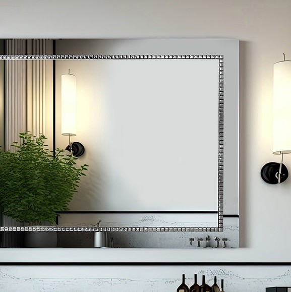 Espejo rectangular para baño con marco hecho de espejo color grafito, decorado con mosaicos plateados de cristal. Una pieza excepcional de alto valor decorativo que combina a la perfección con interiores decorados con glamour donde se busca un complemento elegante y refinado.