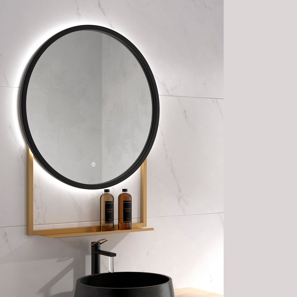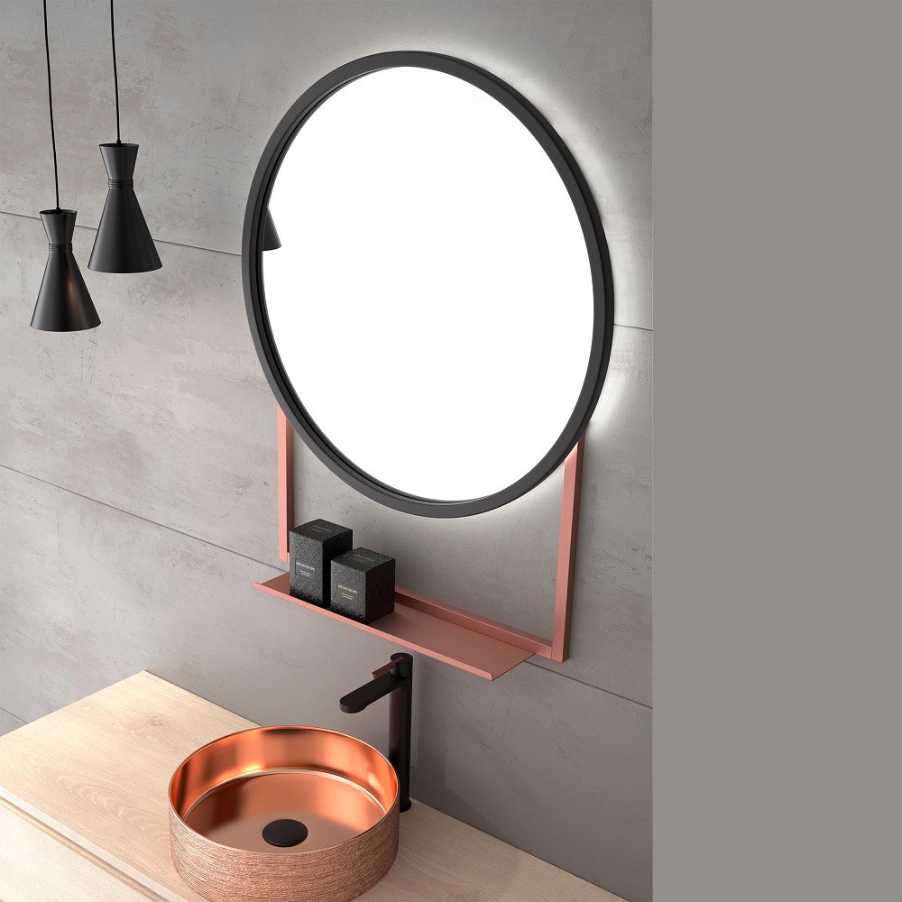 Espejo redondo retroiluminado con estante. La elegancia de este espejo destaca gracias a su forma simple, detalles refinados así como su soporte con estante, disponible en varios colores a elegir. Simple pero con carácter, el diseño redondo nunca pasa de moda. El estante es perfecto para cosméticos o pequeños objetos de aseo.