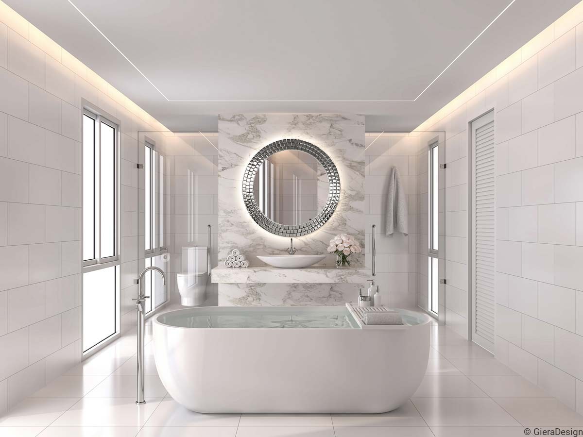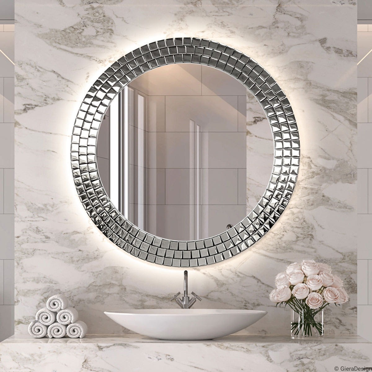 Espejo redondo retroiluminado con marco hecho de mosaicos de vidrio en color plateado. Una pieza excepcional de alto valor decorativo que combina a la perfección con interiores decorados con glamour donde se busca un complemento elegante y refinado. Perfecto para vestir la pared de un salón comedor, recibidor, hall o dormitorio.