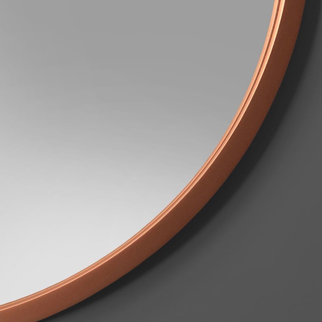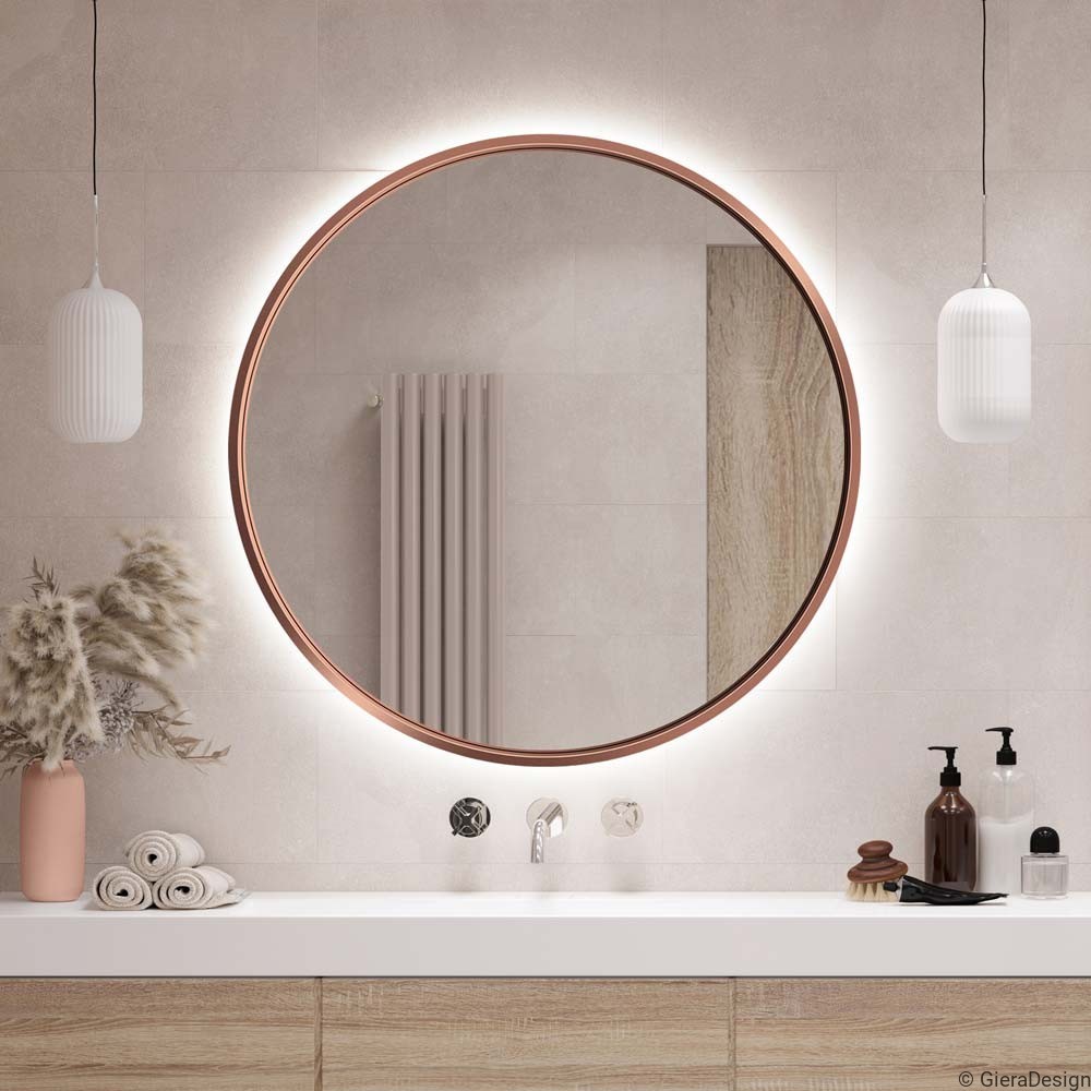 Espejo redondo con marco cobrizo y retroiluminación LED, ideal para baños elegantes y modernos con materiales nobles. Su forma simétrica aporta equilibrio visual, mientras la luz perimetral crea una atmósfera cálida y acogedora. El acabado cobrizo resalta sobre superficies como mármol o madera, aportando un toque sofisticado y contemporáneo. Este espejo decorativo combina funcionalidad y diseño refinado, ideal para proyectos de interiorismo que buscan piezas con carácter. Espejo de baño con luz integrada y marco cobrizo, perfecto para espacios exclusivos.