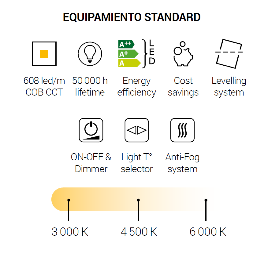 Efecto luz continua: Fría: 6000K, Neutra: 4500K, Cálida: 3000K.