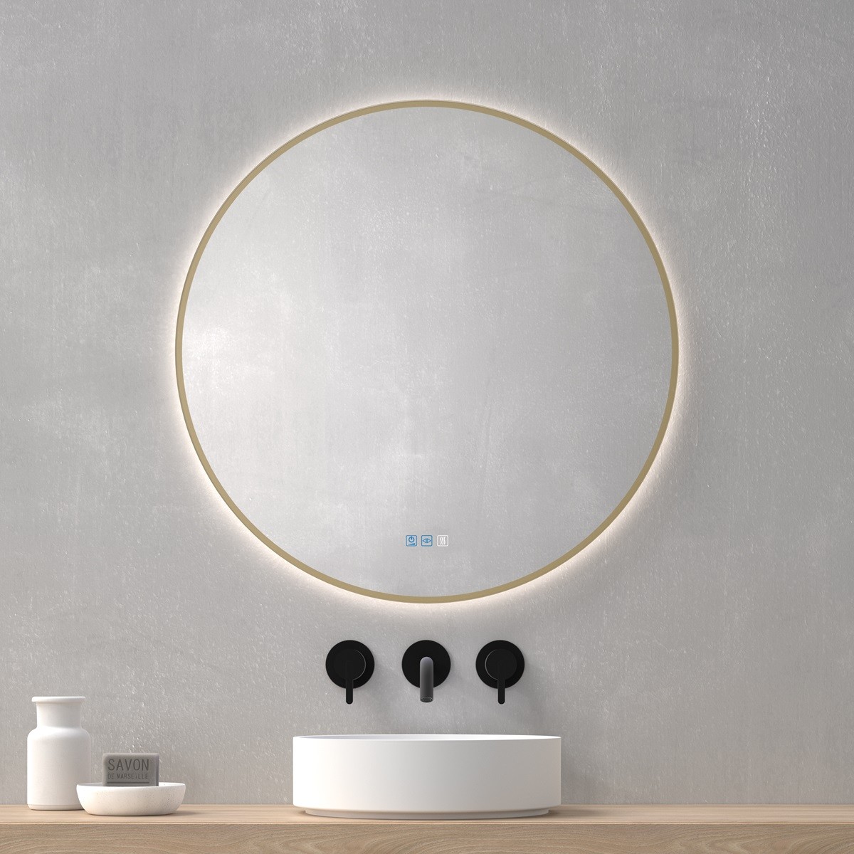 Este espejo redondo retroiluminado con contorno dorado aporta calidez, diseño y sofisticación al baño. Su iluminación LED trasera suave crea un efecto halo que realza la pared sin deslumbrar, mientras que el marco dorado pintado define el perímetro con elegancia. Equipado con controles táctiles y función antivaho, es una pieza perfecta para quienes valoran la tecnología integrada en un diseño atemporal. Este espejo con luz LED y marco dorado es ideal para baños modernos con toques de lujo sutil.