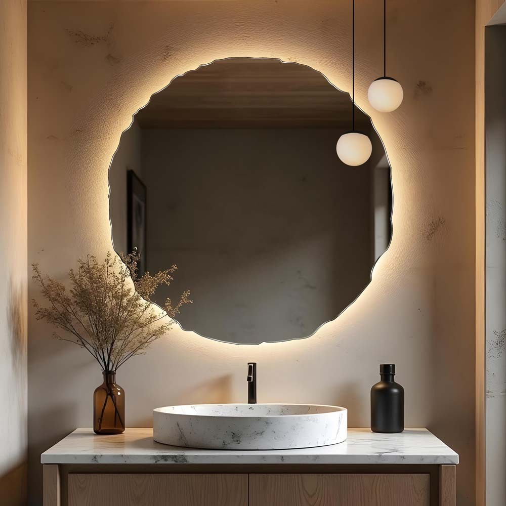 Este espejo redondo con borde irregular e iluminación LED integrada es la elección perfecta para quienes buscan originalidad y sofisticación en su baño. Su forma orgánica y textura inspirada en la naturaleza lo convierten en un elemento decorativo distintivo. La luz LED cálida crea una atmósfera acogedora y funcional, ideal para el ritual diario. Fabricado con cristal de alta calidad y acabado artístico, este espejo decorativo de baño moderno añade personalidad a cualquier espacio. Ideal para interiores contemporáneos, nórdicos o tipo spa.