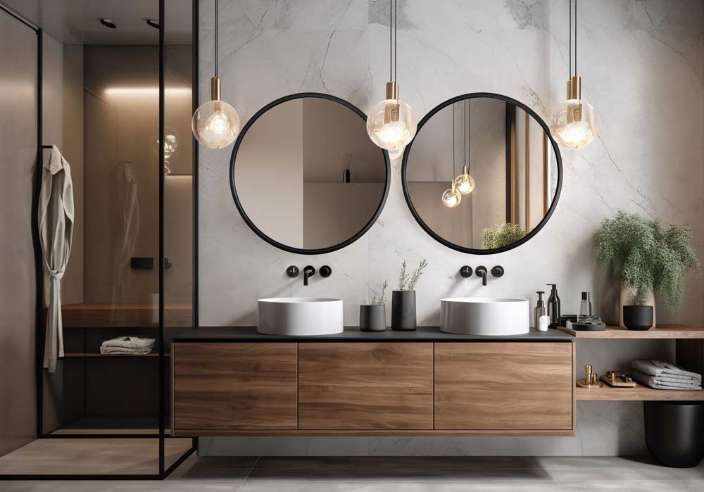 Este espejo redondo con marco negro es la pieza ideal para realzar cualquier baño de estilo contemporáneo. Su diseño limpio y elegante aporta equilibrio visual, mientras que el marco negro proporciona un contraste moderno perfecto. Ideal para baños con grifería y accesorios oscuros, este espejo decorativo destaca por su versatilidad, adaptándose tanto a interiores escandinavos como industriales. Una opción funcional y con carácter que combina a la perfección con materiales como la madera, el mármol o el microcemento.