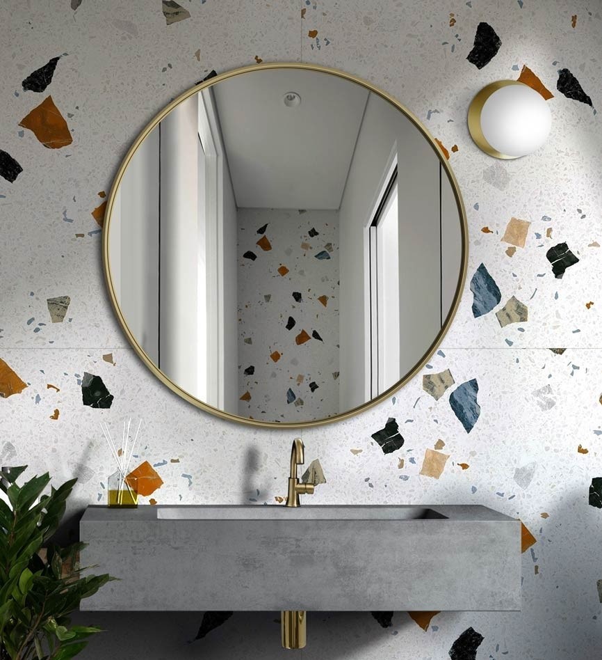 Este espejo redondo con marco dorado es la opción perfecta para quienes buscan un baño moderno con un toque de lujo. Su diseño minimalista y sofisticado combina un fino marco dorado con una forma circular que aporta armonía y amplitud visual. Ideal para colocarlo sobre lavabos de cemento, madera o mármol, este espejo refleja la luz y realza la decoración. Fabricado con materiales resistentes a la humedad, es tanto estético como funcional. Aporta carácter y elegancia atemporal a cualquier baño contemporáneo.