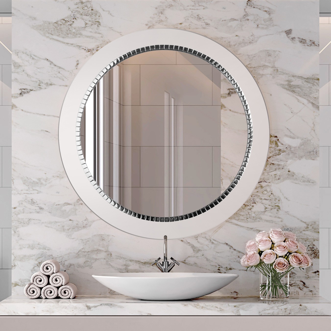 Espejo redondo para baño con marco hecho de cristal lacobel blanco, decorado con mosaicos cuadrados plateados. Una pieza excepcional de alto valor decorativo que combina a la perfección con baños decorados con glamour donde se busca un complemento elegante y refinado.