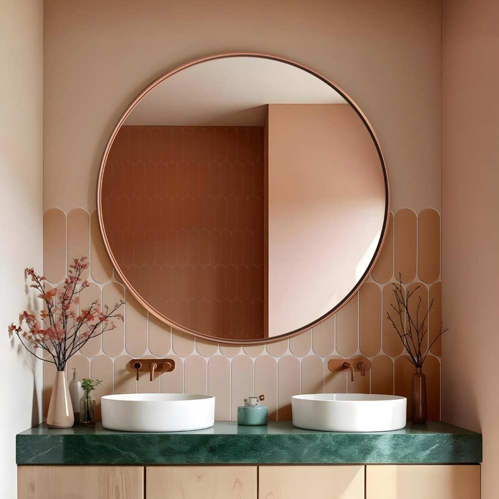 Este espejo redondo con marco en color cobre es la combinación perfecta de diseño minimalista y sofisticación. Su estructura delgada en tono cobre aporta calidez y distinción, ideal para baños modernos, vintage o de estilo nórdico. Su gran tamaño mejora la sensación de amplitud y refleja la luz de manera uniforme, creando un ambiente armonioso. Fabricado con materiales de alta calidad, es resistente a la humedad y fácil de instalar. Perfecto para transformar tu baño en un espacio elegante y acogedor.