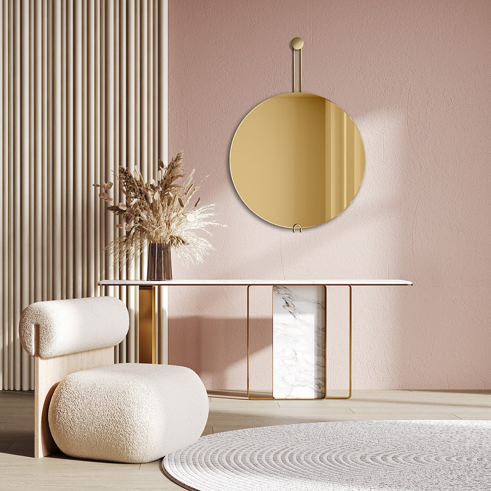 Este espejo redondo dorado con eslinga de latón es una joya del diseño contemporáneo. Su cristal con acabado dorado aporta un reflejo cálido y sofisticado, mientras que el elegante colgador de latón pulido añade un detalle decorativo único. Perfecto para recibidores, tocadores o dormitorios con estilo glam o moderno, este espejo combina funcionalidad y estética. Es ideal para crear puntos focales llenos de luz y carácter. Un accesorio imprescindible para quienes valoran el diseño exclusivo en cada rincón del hogar.