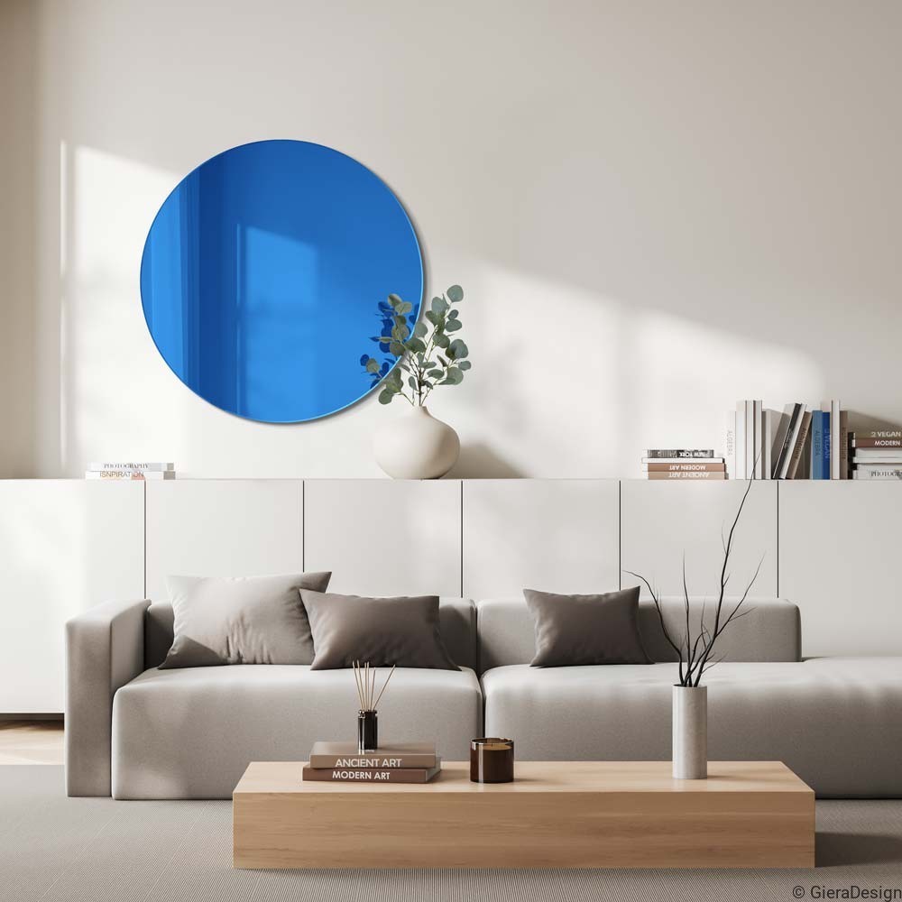 Elegante espejo decorativo de cristal de espejo azul sin adornos. Gracias a su estilo minimalista, este sencillo espejo añade una sensación de calma y equilibrio a cualquier decoración interior moderna. El color azul crea un efecto original y sorprendente. Ya sea para decorar su salón, comedor, dormitorio o recibidor este bello espejo circular no dejará indiferente a nadie.